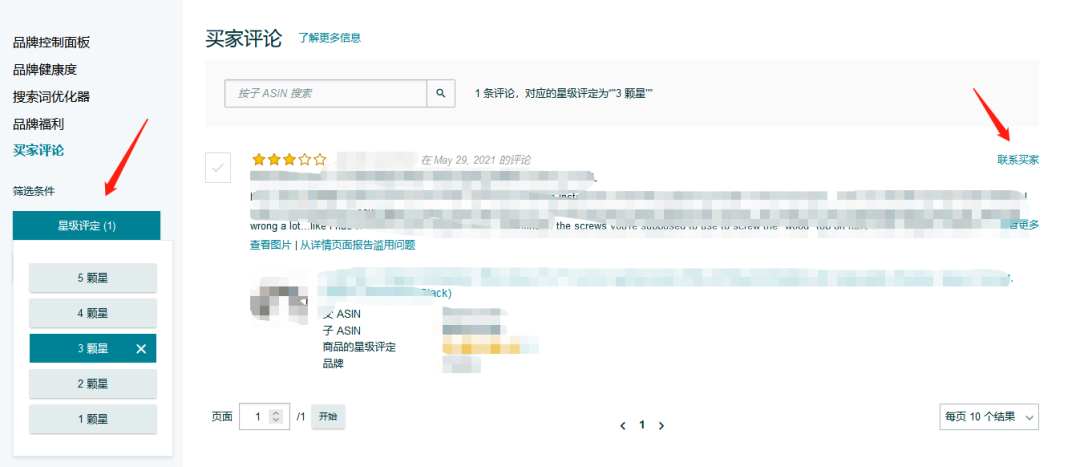 如下图所示,点击卖家后台菜单栏"品牌"-"买家评论",在这个三星差评的最后边多了一个"联系买家"的按钮;