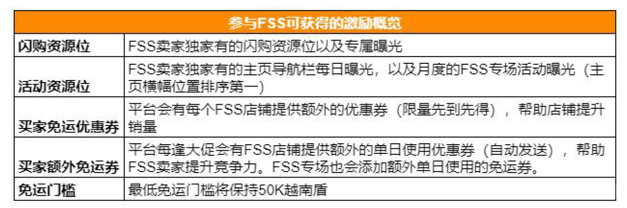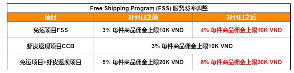 由于越南站点大促月免运活动升级,将为您提供更优质的服务资源,因此自 2021 年 3 月 1 日起,越南 站点免运项目(简称 FSS)将进行以下的服务费费率调整: