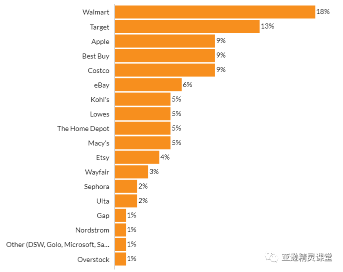 Prime Day 已成为在线零售的主要力量,它影响了整个零售行业的销售。如下图所示,Digital Commerce 360 和 Bizrate Insights 对 505 名购物者的调查显示,沃尔玛公司、Target Corp. 和其他公司从 Prime Day获得了巨大的利益。