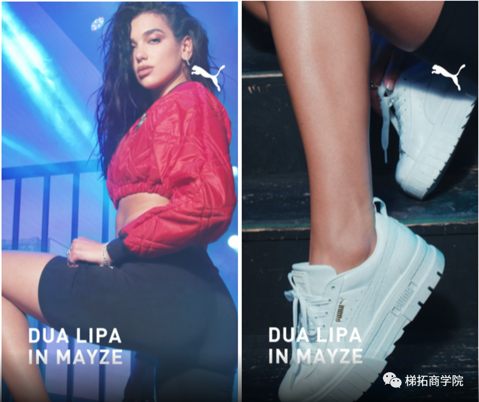 PUMA 为注重时尚的年轻女性设计了时尚前卫的 Mayze。该品牌与知名音乐人 Dua Lipa 合作,作为运动鞋的代言人,帮助这款运动鞋成为众人瞩目的焦点。为了更进一步并达到大众认知,PUMA 将这位流行歌星的名声与 TikTok 的流行结合起来,打造了一项旨在推动需求的活动。