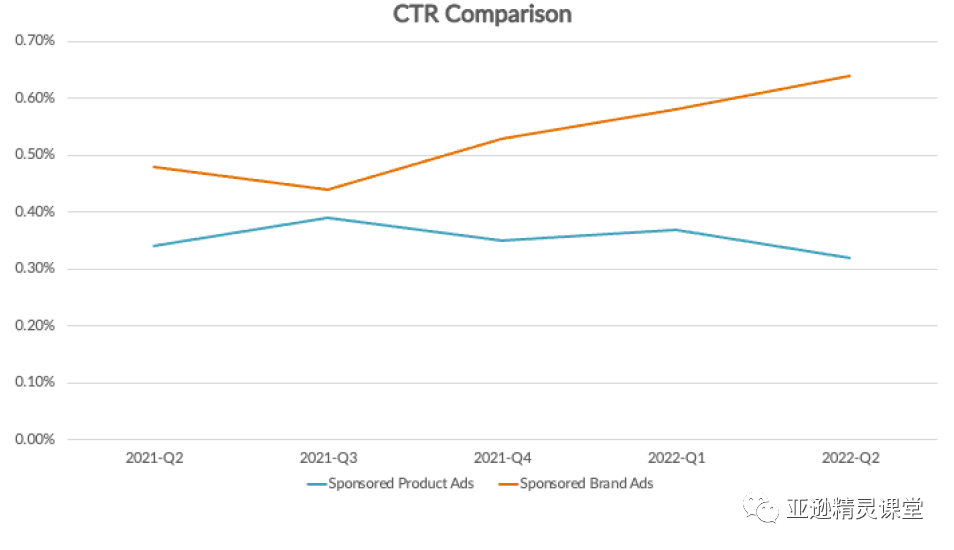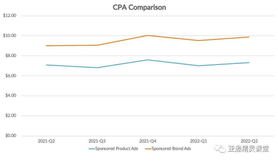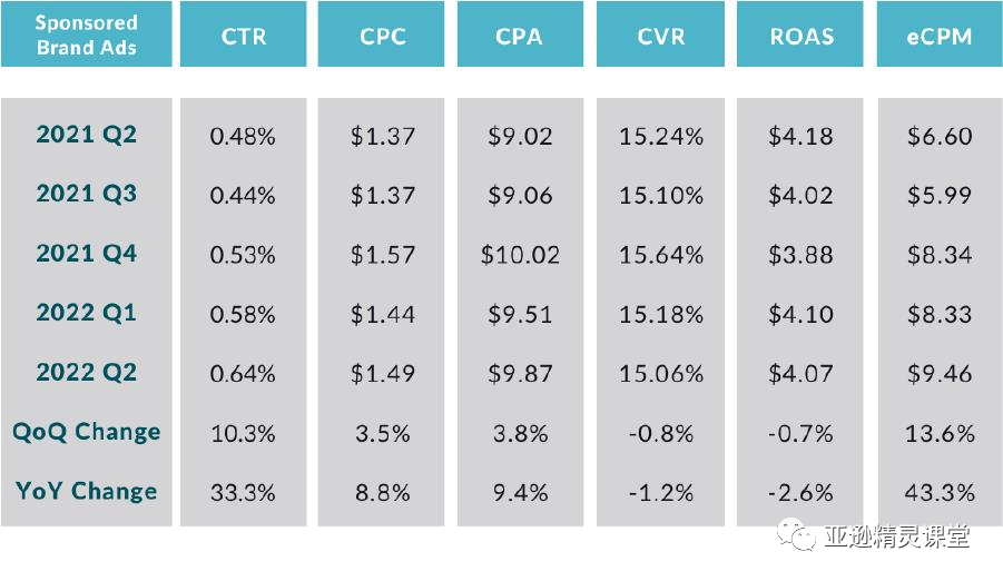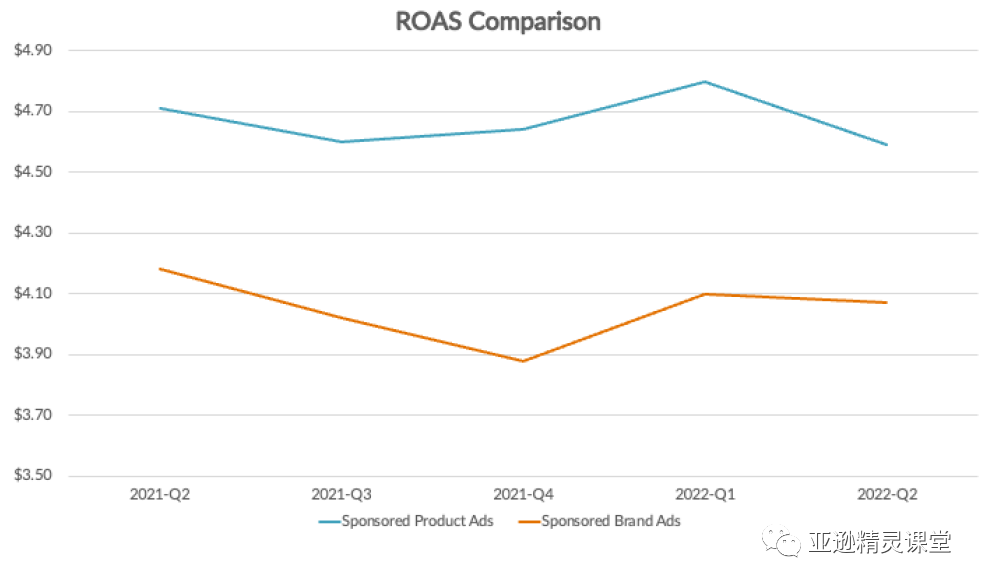2022 年第二季度商品推广的平均单次点击费用为 1.24 美元,品牌推广为 1.49 美元。这基本符合预期,大部分卖家上品牌广告都希望广告被展示在首页搜索结果下方,因此单次点击成本高一些是合理的。ROAS(广告支出回报率)对比