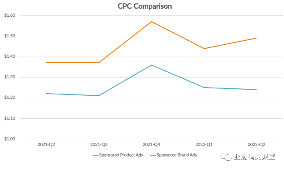 Pacvue的报告显示,在第二季度,亚马逊的单次点击成本保持相对平稳。亚马逊CPC广告的平均单次点击费用为 1.24 美元,环比仅下降 0.8%,同比仅增长 1.6%。