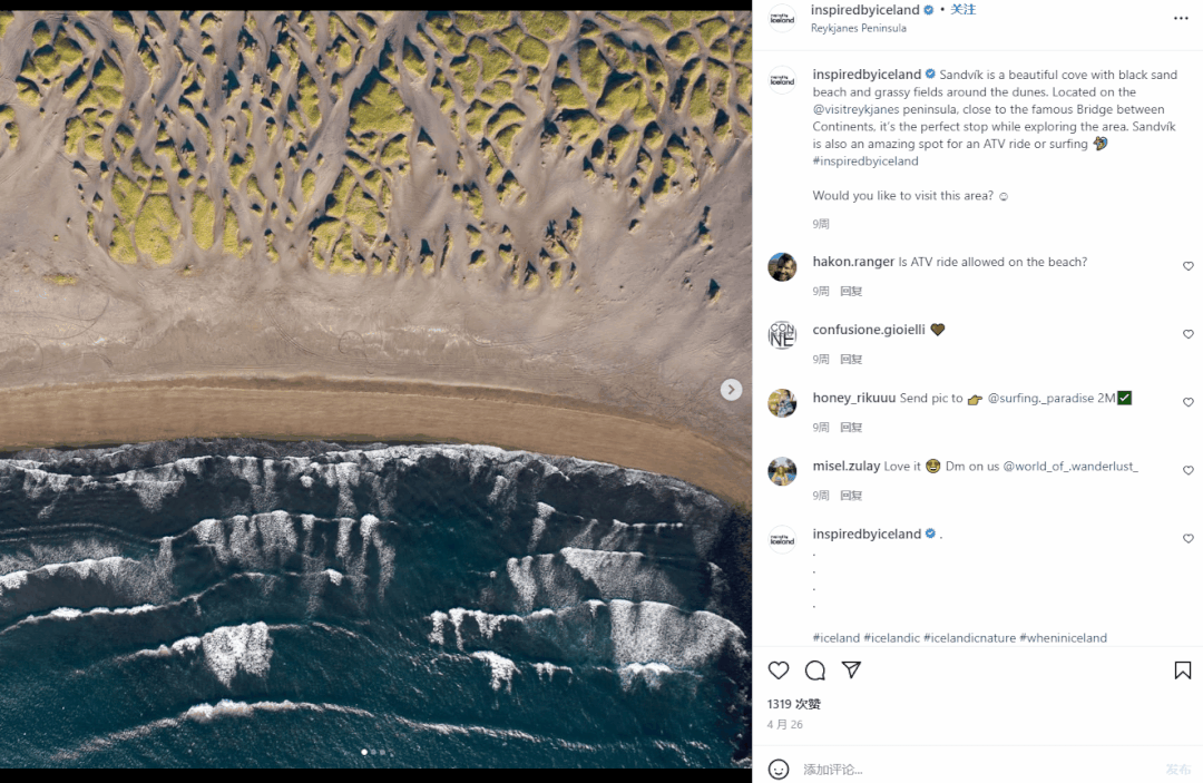 它创建了一个Instagram账户,现在已经有16.1万名粉丝。在该账号上,UGC内容被用来宣传冰岛的美丽和其令人惊叹的风景,而UGC参与的活动还有一个特定标签#inspiredbyiceland,现在也已经被使用了超过463K次。这足以让旅行者想再次背上行李一睹冰岛的美貌。