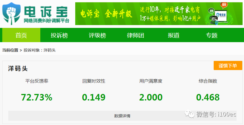 根据"电诉宝"受理的跨境电商领域用户有效投诉显示(依据投诉量排行),洋码头排名第一位,最新评级为"谨慎下单"。2022年至今,其他被投诉的类似电商平台还有:全球速卖通、熊猫生活、海带宝、天猫国际、考拉海购、别样、中免日上、海狐海淘、德国BA保镖商城、86华人商城、闪亮时刻海淘、冰冰购、亚马逊、剁手帮、Feelunique、洋葱、羊贝比海淘、敦煌网、Bon............. 原文转载:http://fashion.shaoqun.com/a/1189319.html