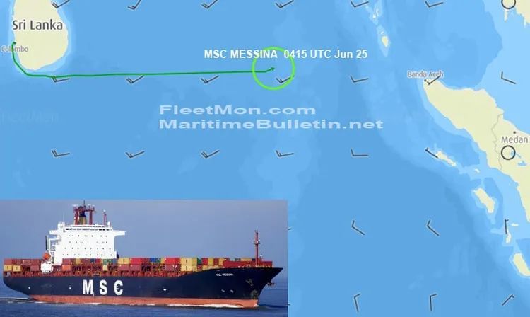 截至UTC时间6月25日0415时,该船仍然处于漂浮状态无法航行。事发时该轮正途中在从斯里兰卡科伦坡驶往新加坡,根据相关资料显示,"MSC MESSINA"轮建于1995年,运力为4953TEU,挂利比亚船旗;曾挂靠国内青岛、江阴、盐田等港口。最近挂靠港如下: