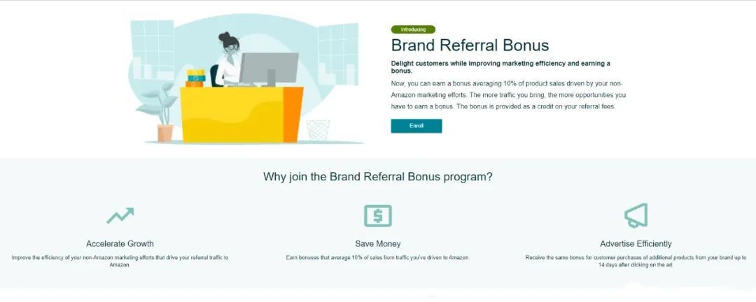 当卖家作为品牌推荐奖金计划的成员,便可以获得平均 10%的奖金,这些奖金是由非亚马逊营销工作推动的产品销售额。非亚马逊营销工作带来的流量越多,获得奖金的机会就越多。(奖金作为佣金的抵免额提供)