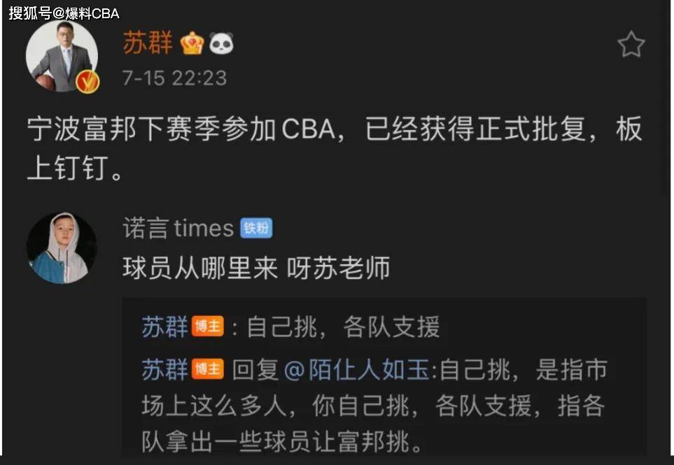 北京时间7月16日,昨天晚上,一则重磅消息轰动了朋友圈。那就是著名体育人苏群老师确认,下赛季宁波富邦男篮将正式加入CBA联赛,成为联盟的第20支球队。而针对宁波富邦男篮的人员组成,苏群老师也是给出了明确的答复,那就是联盟中的球队将会各送出两名球员,富邦男篮在这些候选球员名单中挑进行挑选。