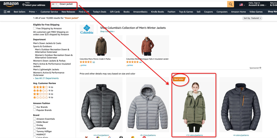 亚马逊绝大多数客户都是通过搜索购物,他们往往只会看前几页的产品,一旦你的关键词上首页便获得大量曝光,用户购买产品的机率非常大。这就是在告诉我们,关键词在亚马逊运营中有多重要了!我们以冬季羽绒服为例,在Amazon搜索看看头部商品的销售情况。