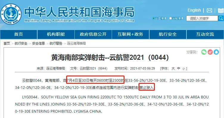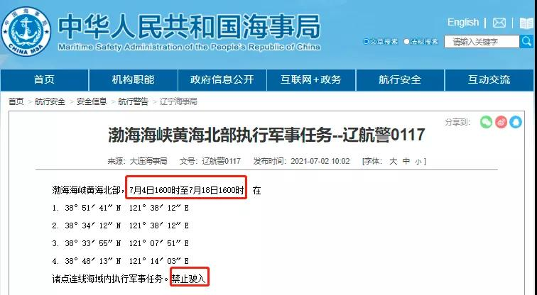 7月4日至30日期间,渤海海峡;黄海北部、中部、南部海域因军演演习、实弹射击实施禁航。