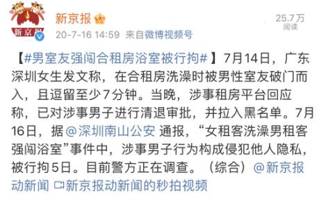 去年七月,广东深圳一女生就曾发文称,在合租房洗澡时被男性室友破门而入,女生惊吓之下,男生依旧逗留许久。