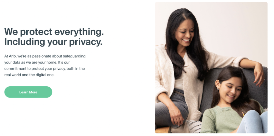 三高:高内容、高触达、高效率高内容:从品牌底层设计更容易触达消费者心智的"差异化""优势""利益点"高触达:通过有目的的设计,使内容更容易影响消费者心智高效率:使用恰当的通道,使得这些内容传播给更多的、精准的潜在客户消费者购买智能安防产品是为了更好地保护家人/办公环境的安全,保护消费者关心的人和环境的安全是基本需求。除此之外,在智能安防产品的购买中,消费者还关心其他什么问题?这就需要品牌进一步挖掘。不难发现,一旦涉及到数据,消费者就会有不安和疑惑。现代的消费者对隐私安全相当关注,在保障安全的前提下,还能确保信息安全不被泄漏,对安防产品日常拍摄和录制到的视频/照片内容进行严格保密,至关重要。了解这点后,就要选择渠道,以便提高触达的效率和质量,传播给更多的、精准的潜在客户。不妨看看 Arlo 的例子:Arlo 认为"保护消费者现实生活和数字生活的安全是品牌的使命"(It's our commitment to protect your privacy, both in the real world and the digital one.),因此在独立站官网的首页通过"文字+场景图片"的形式把这一个信息充分传达给消费者。