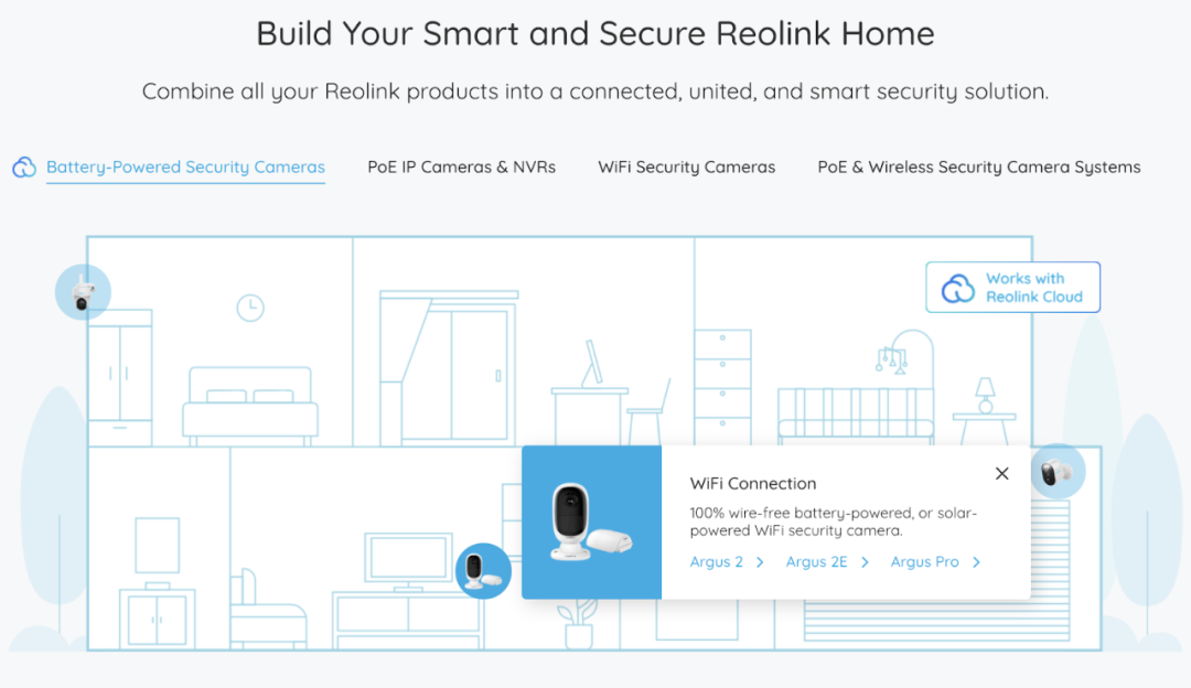 精细化运营,提升产品复购/连带率/高利润产品购买客户取得成本 = (客户获取成本+客户保留成本)/ 2复购率=超低成本流量=裂变可能性=企业抗风险能力随着外部渠道流量购买成本的逐步提高,品牌的获客成本也在不断上升,因此每一个引入到独立官网的流量都争取做到不浪费,即使不能马上转化,也需要先通过各种营销手段让潜在的消费者成为品牌订阅用户或者注册用户。也是出于同样的原因,在独立站站内对产品进行精细化运营也是提高转化率的重要一环,为的是挖掘到每位用户的最优价值。智能安防品牌 Reolink 在独立站消费者旅程(即消费者在独立站中的行为路线)中有个重要发现:消费者在家庭场景中对不同区域(如客厅、室外、卧室)的智能安防设备有不同的产品需求。这个发现促使 Reolink 思考:如何能满足消费者在有限的独立站浏览时间内尽快找到合适的产品?通过多次消费者调研后, Reolink 发现运用具像化且有互动效果的购物指引图能够很大程度地帮助到消费者,消费者只要点击想关注的区域,该区域就会显示出推荐产品的具体信息,并有不同的推荐产品供消费者选择。