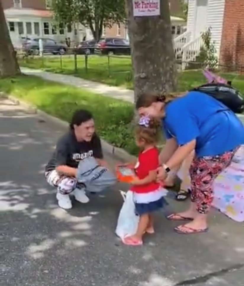然后走到给街边的小朋友从袋子里拿出商品分发,