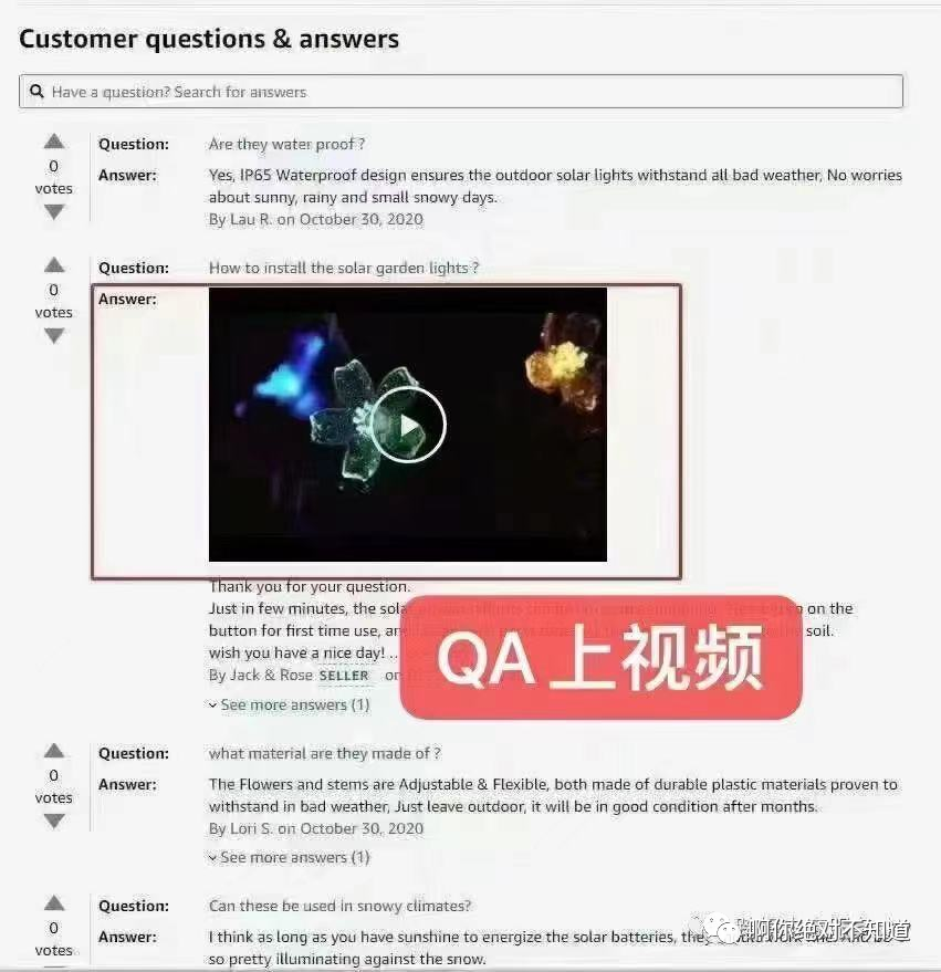 对于卖家而言,可以将主图视频中剪辑一部分出来(针对产品某项功能或特点进行说明、补充或解答),上传到QA那里,同时加上文字回复,效果更加明显。这个QA视频展示位,虽然并没有像主图视频和视频广告那样,对转化率产生明显的影响,但还是有一定的辅助作用,至少能够更加生动形象地解答消费者对于产品的疑问,间接促使消费者快速完成购买决策。有兴趣的卖家可以好好利用一下这项功能。![]()