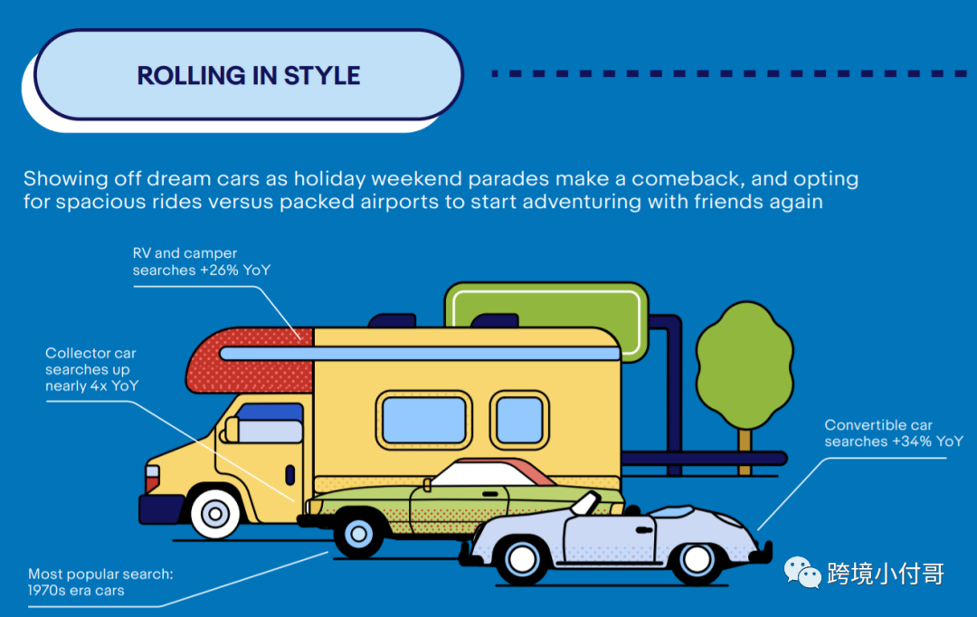 8,在前台搜索数据中,房车和露营车的搜索同比增长26%,敞篷车的搜索量同比增长近34%,6月份最受欢迎的搜索词:20世纪70年代的汽车。