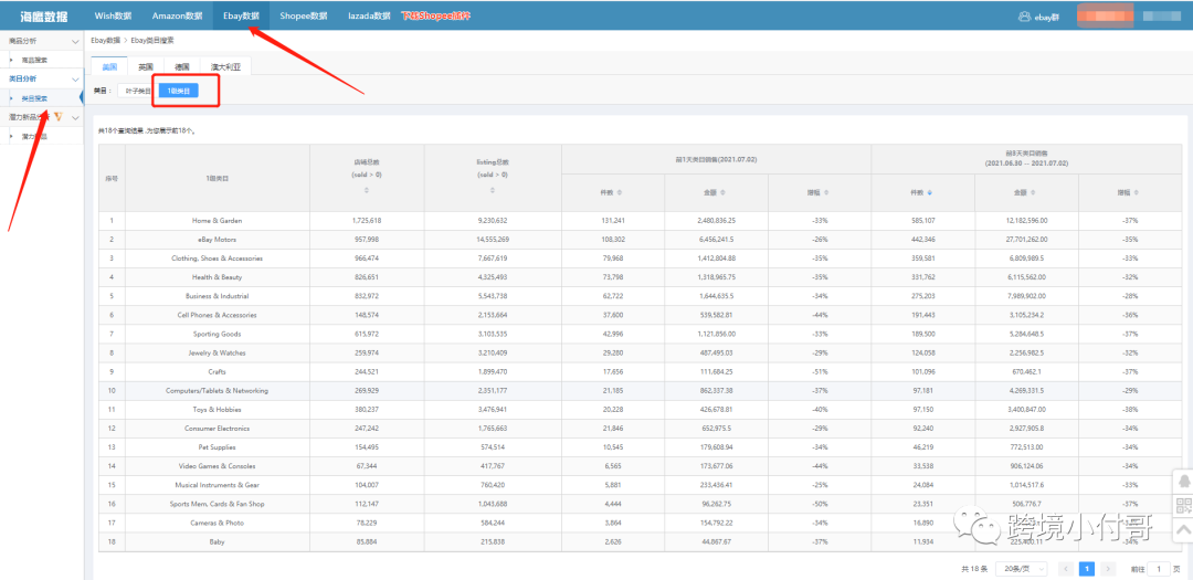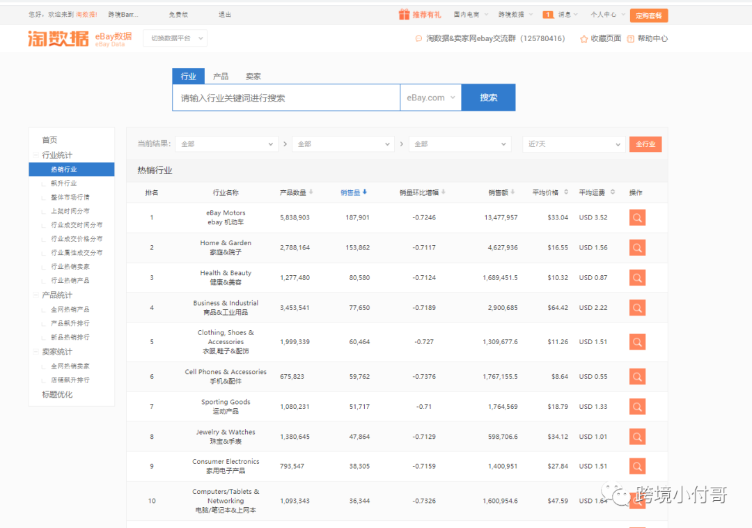 我们再利用淘数据软件也可以精准的获取eBay平台的热销数据,通过近期的热销TOP行业,TOP产品,辅助自己来选品、来定价等。当然不同的站点情况都有所区别,整体而言数据还是非常精准的。