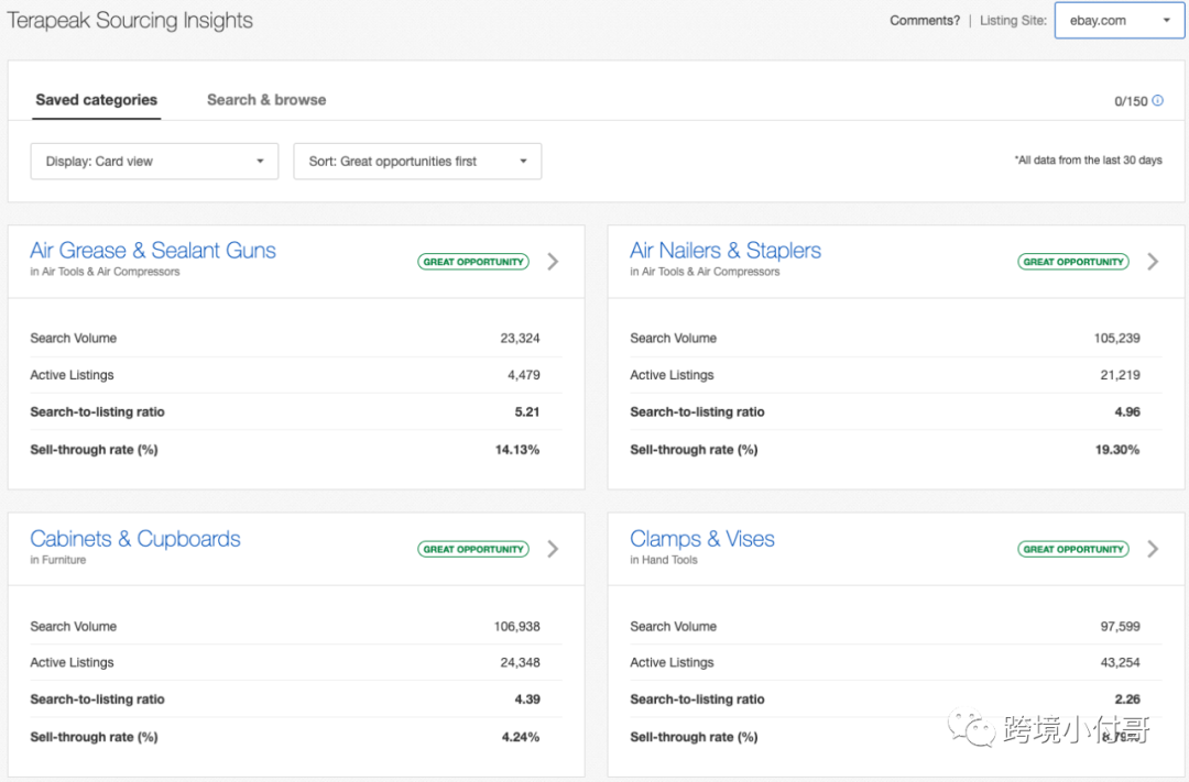 对于表现不佳的商品,您可以使用 Terapeak 产品研究来确定有竞争力的商品,并确定照片、价格、商品细节等方面的最佳做法。对您自己的列表进行的一些细微更改可能会对吸引买家产生巨大影响。⑤:Terapeak Sourcing InsightsTerapeak Sourcing Insights 可帮助您就下一步销售什么做出数据驱动的决策,从而在竞争中保持领先地位。它会自动识别巨大的机会——高需求和低供应的类别——以帮助您找到新的高潜力领域来发展您的业务。![]()