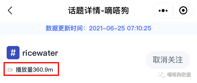 根据嘀嗒狗小程序记录的话题数据显示,该话题在6-25时有360.9M的播放量。
