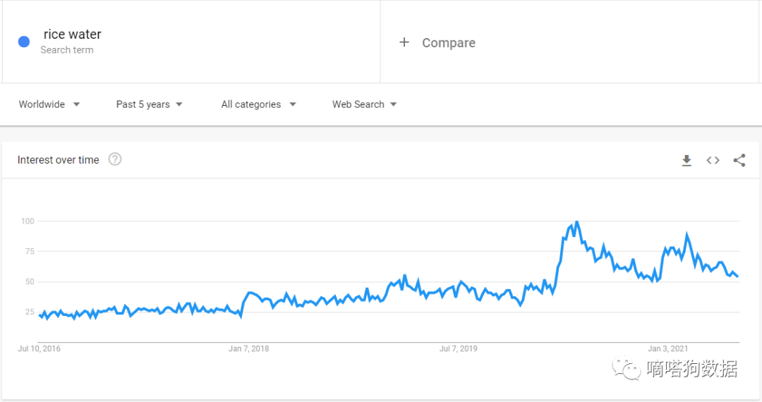 通过谷歌趋势我们可以了解到一定时期内,产品关键词在搜索引擎上的搜索热度趋势。查询Google Trends可以发现,最近5年内关于"Rice Water"关键词内容的搜索正呈现不断波动增长的趋势。