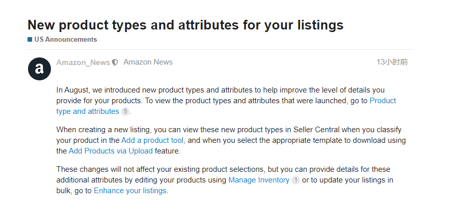 公告中,亚马逊表示自8月起,他们就已引入了新的产品类型和属性,还表示,此举可以帮助广大卖家朋友提高产品信息水平。