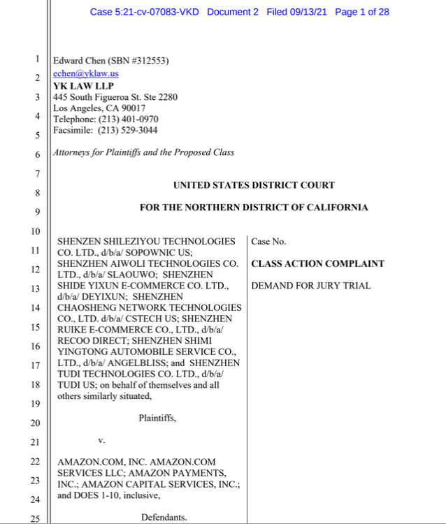 封号容易解封难……中国卖家路在何方?一直是近阶段行业一直在讨论的话题。就在国庆前的最后一天(今日),部分中国卖家开始集体起诉亚马逊。根据起诉书显示,这些中国卖家承认自己违反了亚马逊的政策,但要求亚马逊返还打击好评返现为由进行的资金冻结。01还钱深圳卖家集体起诉亚马逊据Theverge媒体称,9月13日,多家中国公司就封号事件在美国加州北区地方法院对亚马逊提起集体诉讼,指控亚马逊不当扣留资金。根据法