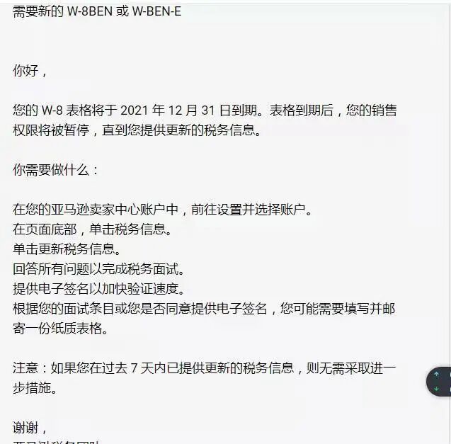 最近不少亚马逊美国站点的卖家收到了亚马逊发来的邮件,主要是关于W-8(W-8BEN简称)表格在12月31日即将到期,需要卖家重新更新,避免影响到店铺的正常运营。卖家收到的亚马逊邮件原文如下: