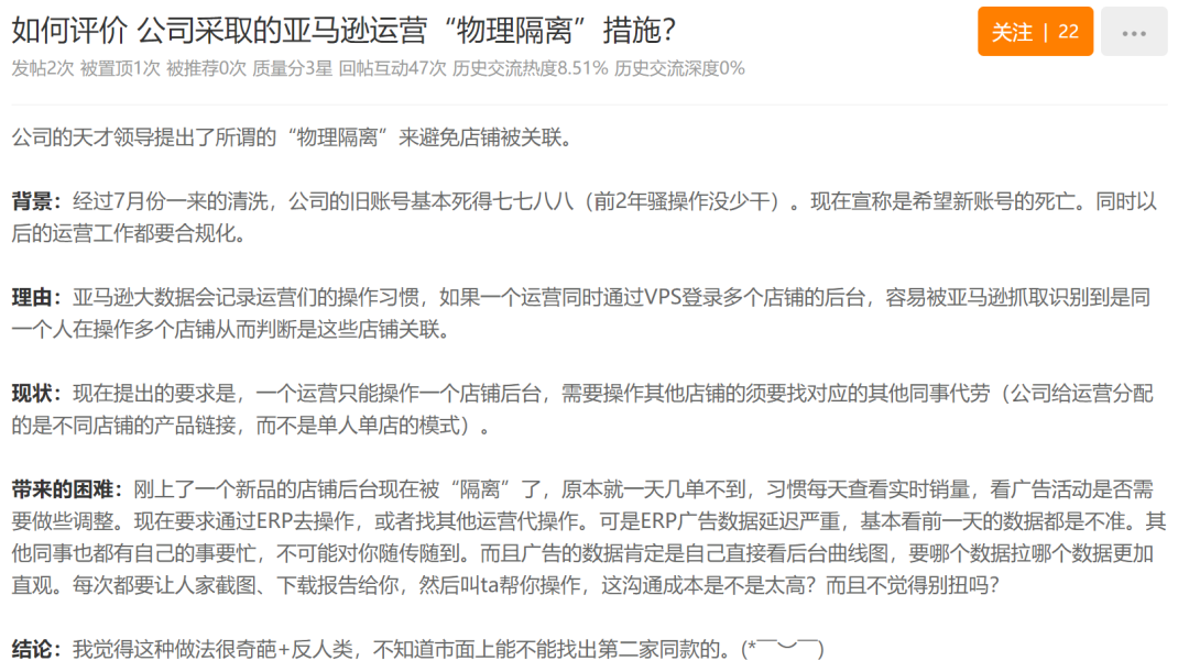 众所周知,亚马逊对卖家账号管控严格,如果亚马逊的程序算法认为某几个账户都是同一个人来操作,那么这几个账号就会被亚马逊认定为相互关联。而且这个一般是系统自动检测的。因此很多卖家对于可能造成关联的所有因素都会非常地小心。卖家又现硬核防关联临近旺季,为了自己的过坎坷的爆单之路除了免受到外界客观因素的影响,有的卖家更是实行起了所谓"物理隔离"的硬核策略。图片来源:知无不言由于该卖家所在公司前两年的诸多暗箱