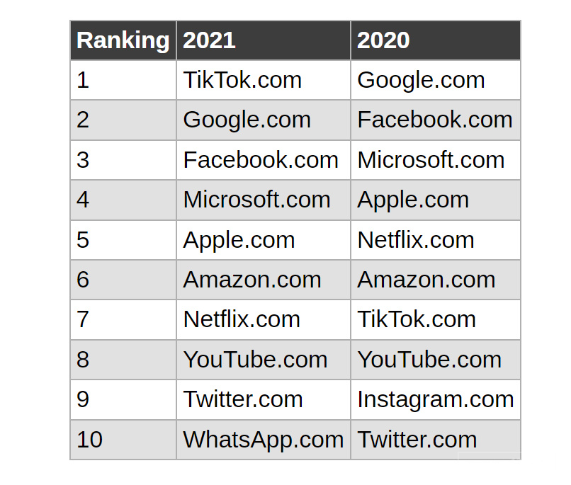 根据网站管理公司Cloudflare的研究,在2021年TikTok成功超越谷歌,登上全球流量榜首,成为最受欢迎的网站。