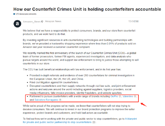 前不久,亚马逊公布的假冒犯罪部门(CUU)的打假成果中也有提及此事~