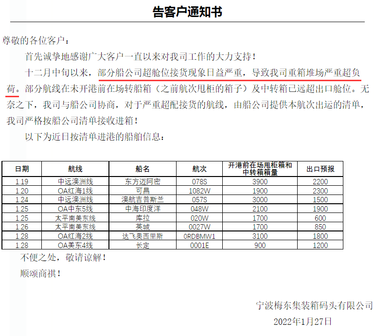 1月27日,宁波梅东集装箱码头发布紧急告客户通知书:十二月中旬以来,部分船公司超舱位接货现象日益严重,导致我司重箱堆场严重超负荷。对于严重超配接货的航线,由船公司提供本航次出运的清单,严格按船公司清单接收进箱!