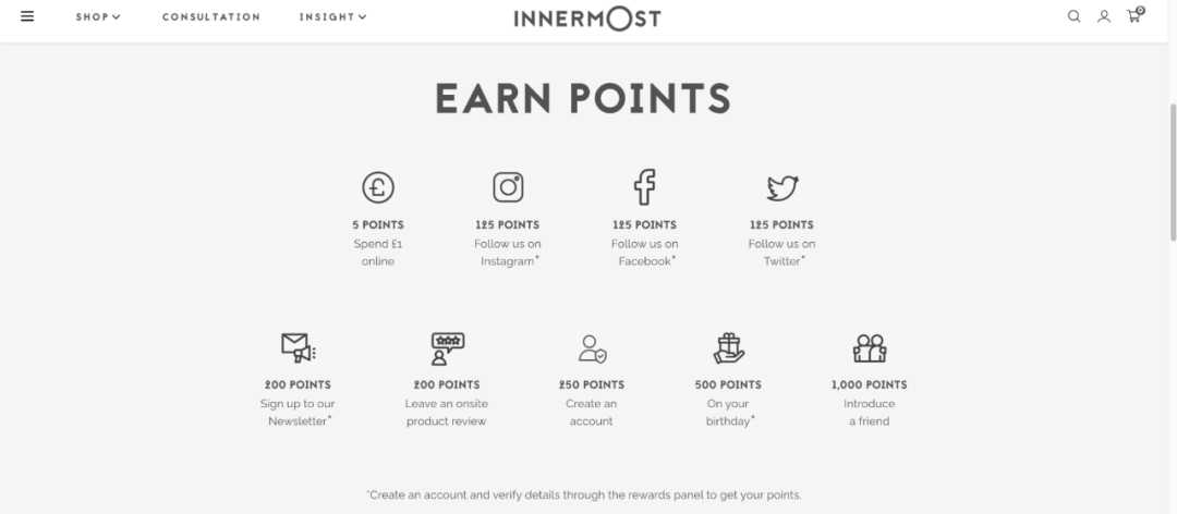 Innermost 是一家英国营养补充剂品牌,它创建了一个相对简单的积分忠诚度计划,即客户消费达到一定金额、或在社交媒体上关注该品牌等方式可以获得对应数额的积分,不同的积分可以享有不同的折扣,并且可以直接用于订单抵扣