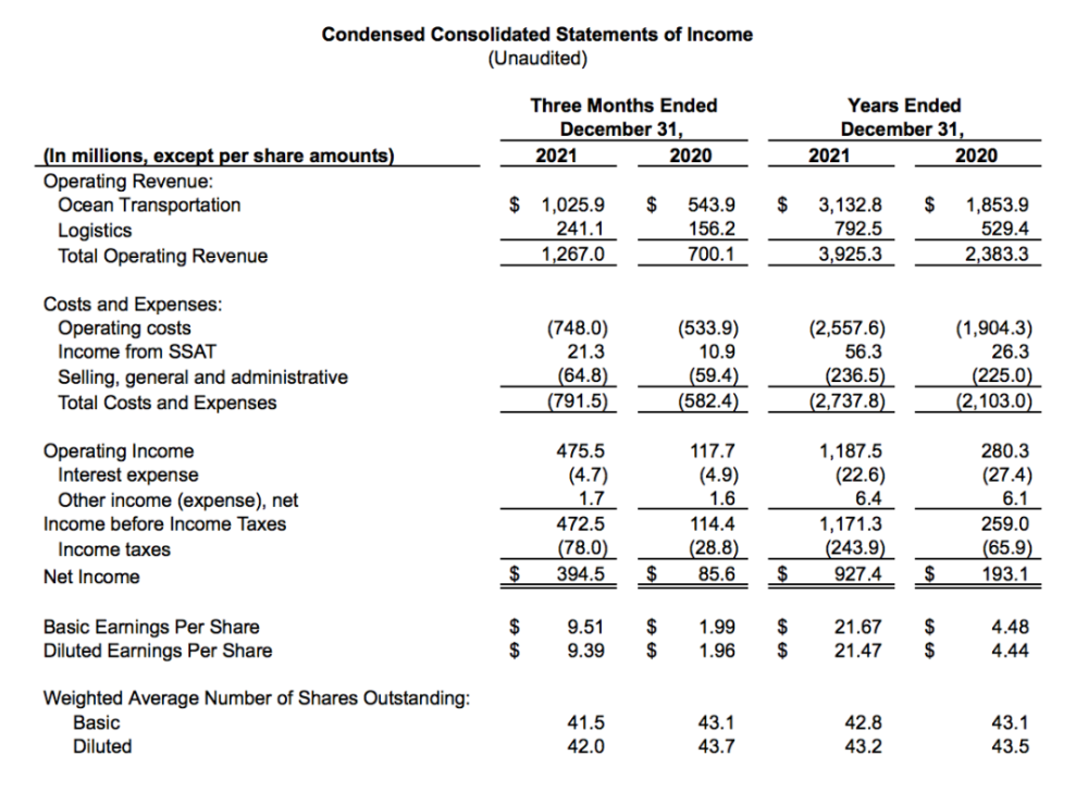 2月17日,美森轮船公布了2021年全年业绩。2021年,该公司实现合并营收(consolidated revenue)39.25亿美元,2020年为23.83亿美元,同比增长64%。