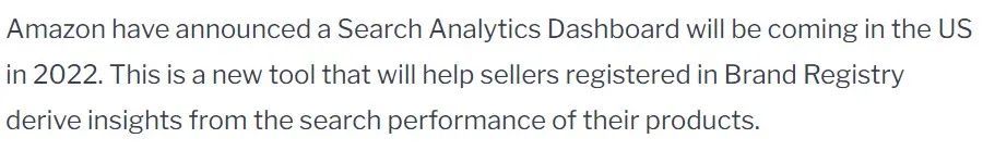 其实早在2021 年 10 月 20 日,在面向美国第三方卖家的Accelerate 2021会议上,亚马逊就宣布了 Search Analytics Dashboard作为一种新工具,将免费开放给在品牌注册中注册的卖家从其产品的搜索性能中获得洞察力。