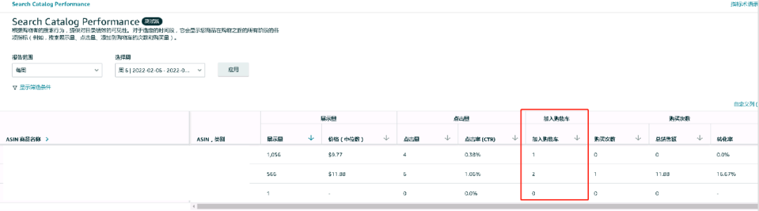 进入到这里就可以查看自己店铺ASIN的展示量,价格中位数,点击量,点击率,加购人数,购买次数,总销售额和转化率的相关指标。