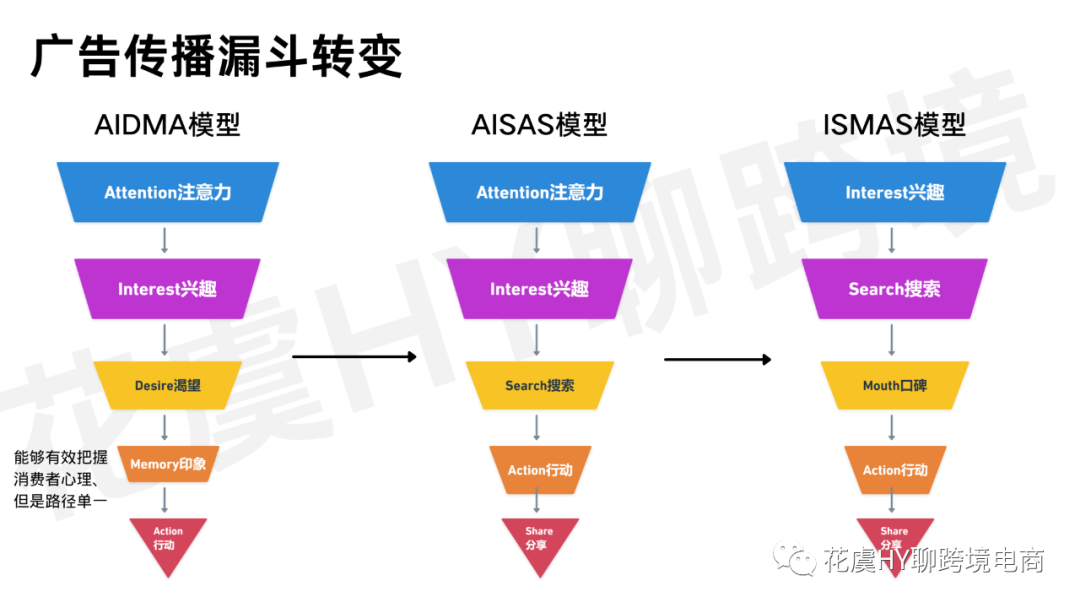 随着互联网的发展,广告传播模型(广告传播漏斗)也从AIDMA(Attention注意力-Interest兴趣-Desire渴望-Memory印象-Action行动)逐渐转变为AISAS模型(Attention注意力-Interest兴趣-Search搜索-Action行动-Share分享)和ISMAS广告传播形式(Interest兴趣-Search搜索-Mouth口碑-Action行动-Share分享);