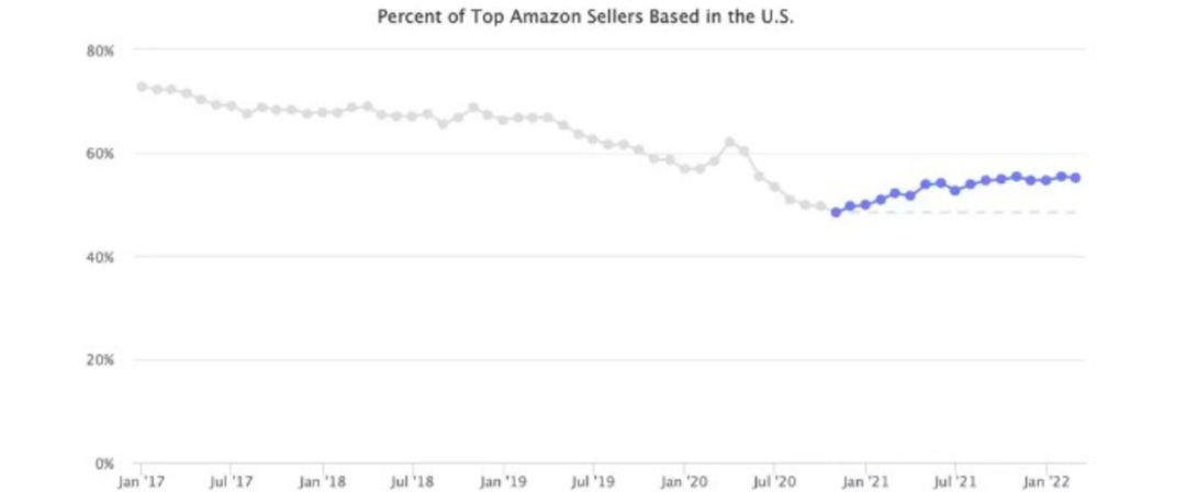 AMZ123获悉,据Marketplace Pulse最新研究,一年多来,美国卖家在亚马逊上的市场份额不断增加,扭转了多年来以中国卖家为主的趋势。 目前在亚马逊美国市场上,55%的顶级第三方大卖家是美国本土企业,与2020年11月的历史最低点48%相比,有了强劲的增长。 这一趋势不仅限于顶级卖家,在过去的十六个月里,美国卖家在亚马逊的市场份额一直在增加。而在之前几年,这一比例一直在稳步下降。