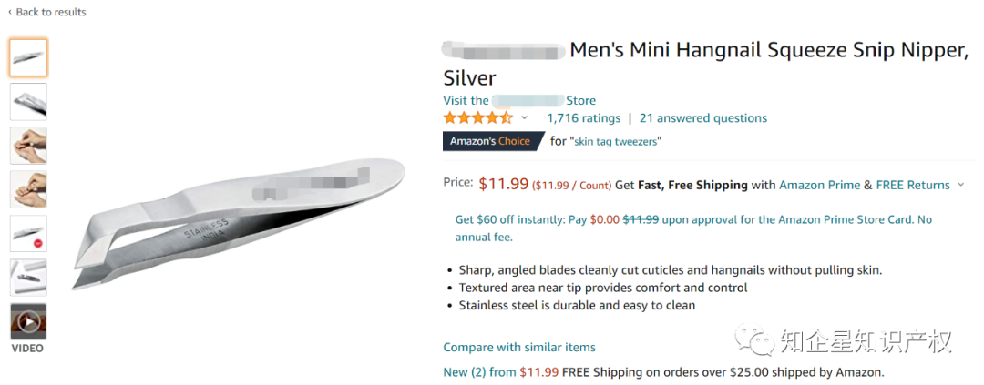 今天在浏览亚马逊的时候,看到一款手指倒刺挤压剪钳,它是美亚站的Amazon'sChoicefor "skin tag tweezers",售价11.99美金,留评1718颗星。