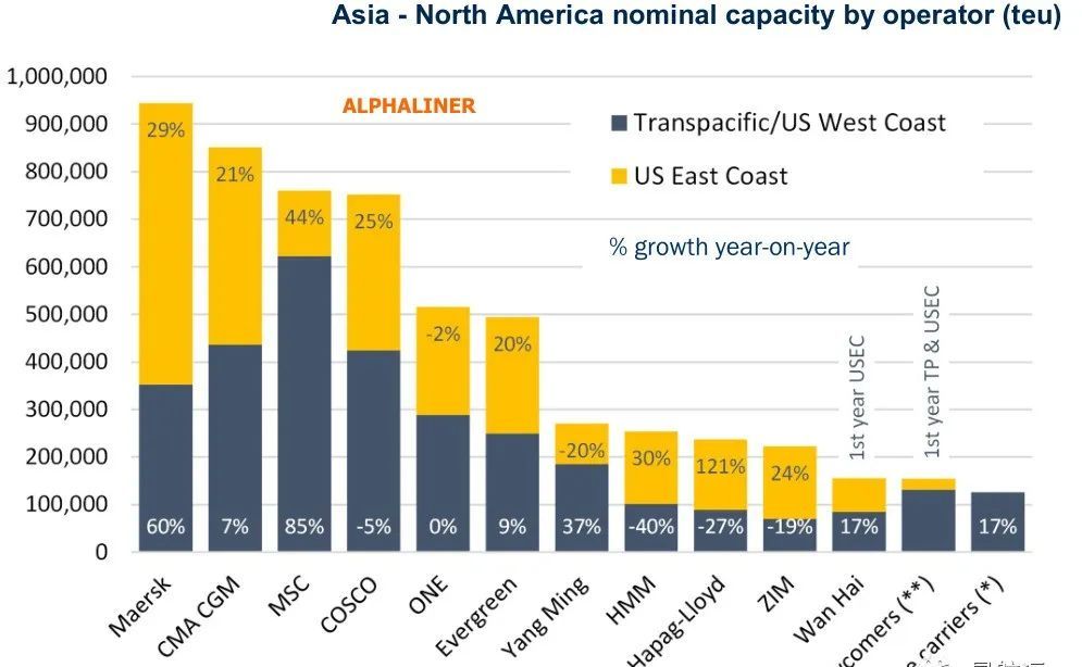 Evergreen、CMA CGM、COSCO、ZIM、Maersk 和 MSC 的亚洲-美东运力共同增长了20%至44%。与此同时,由于联盟内部的吨位重组,ONE和阳明是唯一在这一贸易航线中运力较少的船公司。总体而言,THE Alliance在亚洲-美东贸易中的运力增加了15.7%。