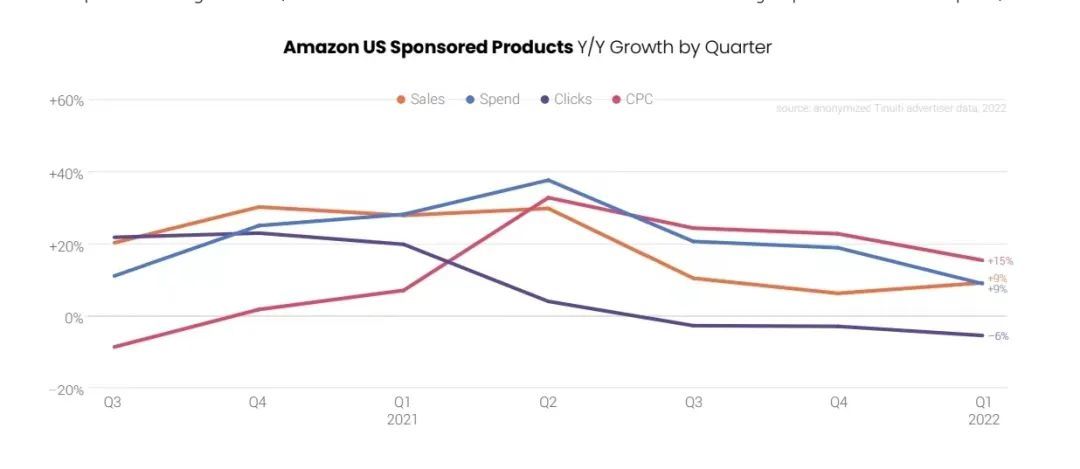 报告数据中显示,2022年第一季度,亚马逊赞助产品消费增长放缓至9%,第一季度点击量(紫色线)同比下降6%,CPC增长持续放缓至2021年Q1以来的最低水平。