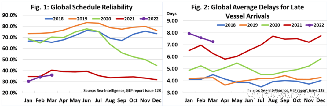 根据 Sea-Intelligence 分析师的说法,尽管 2022 年3月的可靠性数据是迄今为止最高的,但 2022 年 3 月的得分仍略低于 2021 年的水平,他们指出,迟到船舶的平均延误再次下降,这次下降了-0.32 天。2022 年 3 月 7.26 天。