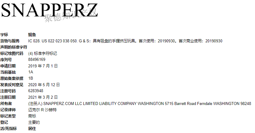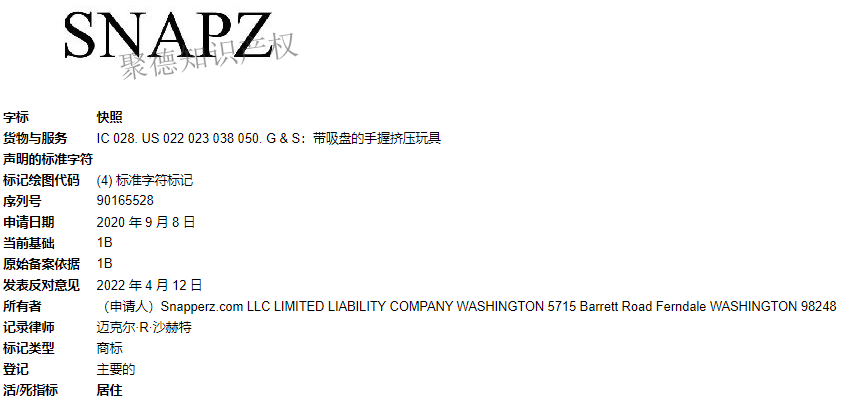 Snapperz在2021年3月2日已经成功注册,注册类目为28类,具有吸盘的手握挤压玩具。
