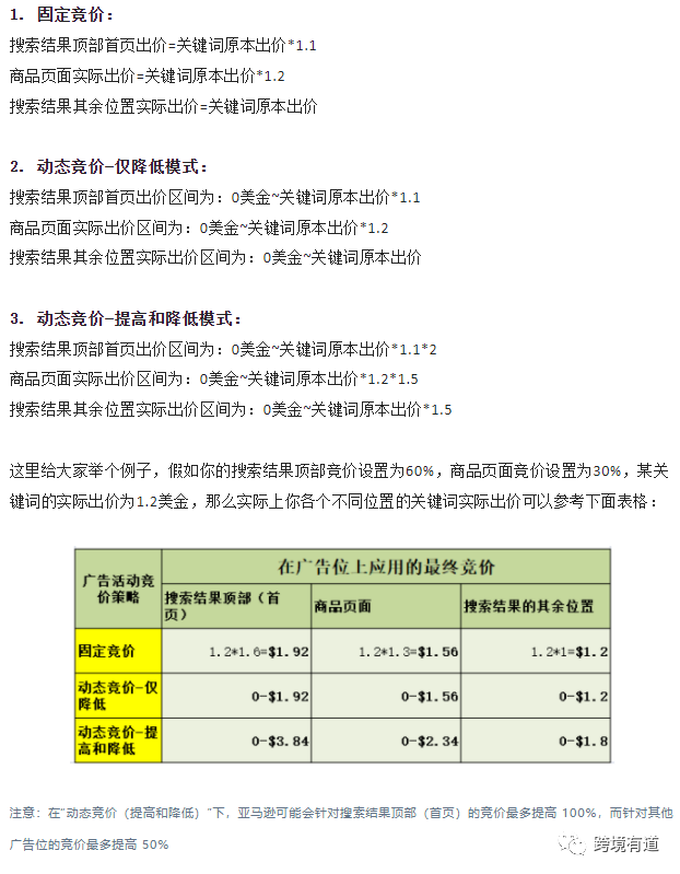从上面的竞价算法中,我们可以看出,当你使用不同动态竞价进行出价的时候,你给亚马逊的实际出价和你在详情页面上的曝光程度也是不尽相同的。
