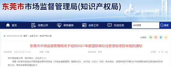 东莞市市场监督局管理局发布关于组织2021年度国际商标注册资助项目申报的通知,有意向申报的卖家千万别错过~