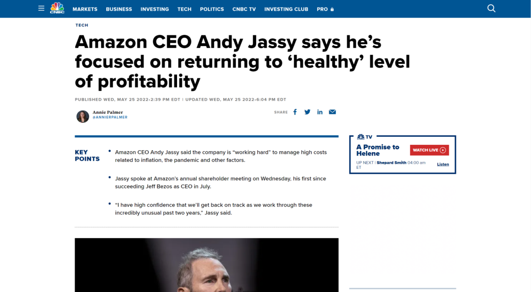 2022年对亚马逊来说是充满坎坷的一年,全球疫情与俄乌战争让供应链本就紧张,加上通货膨胀、仓储过剩等原因,亚马逊第一季度承担了数十亿美元的亏损。而贾西正是在如此的动荡时期接手亚马逊,他声称,亚马逊将专注恢复到"健康的盈利水平"。