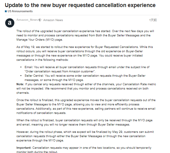 就在今天早上亚马逊发布了一个新规定:更新买家取消订单新体验!具体信息如下: