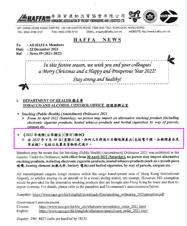 A.香港根据大陆的政策,从5月初开始就不接受电子烟的中转了。