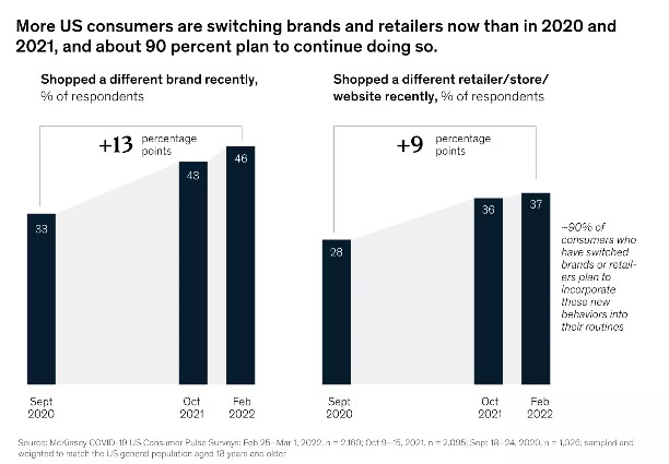 报告称,自疫情以来,2022年更多的美国消费者转向不同的品牌和零售商,原因是越来越多的人正在寻找低价值商品。价格是消费者更换品牌的首要动机,其次是库存。