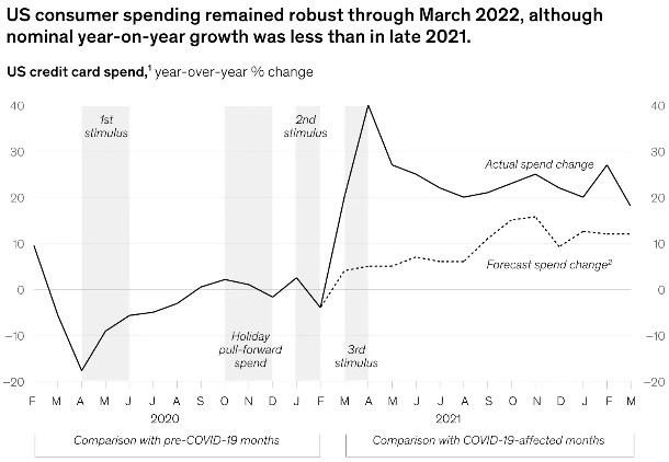 2022年初,在创纪录的通货膨胀中,美国消费者继续提高支出。美国通胀率在2022年3月增长至近8.5%,2021年5月至2022年3月期间出现十年来的最高通胀率。然而,美国消费者在2022年3月的支出比两年前增加了18%,比疫情之前预测的支出增加了12%。