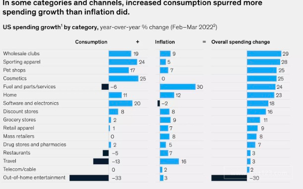 在某些品类中,2022年2月和2022年3月出现的大部分增长是因为销量更多,通货膨胀只占增长的一小部分。尤其是运动服装、宠物用品、化妆品以及电子产品上。