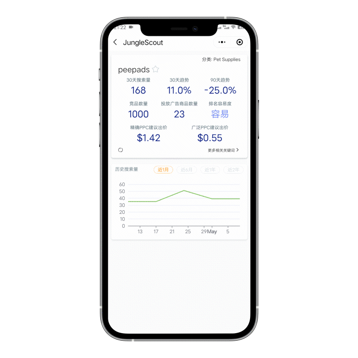 小程序的关键词功能完全承接于网页版中的关键词功能,输入单一关键词就能看到30天搜索量、30天搜索趋势、90天搜索趋势、竞品数量、投放广告数量、排名难度以及精准PPC出价和广泛PPC出价。